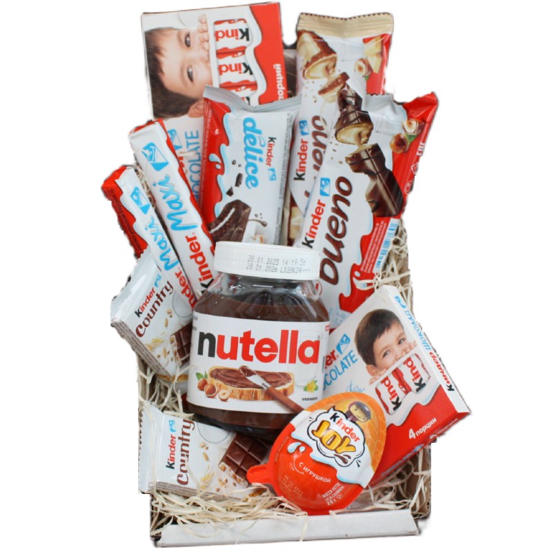 В составе: Киндер Макси - 2 шт. Киндер Шоколад - 2 шт. Шоколадная паста Нутелла - 1 шт. Киндер Буено Белый - 1 шт. Киндер Буено - 1 шт. Киндер Джой - 1 шт. Киндер Кантри - 2 шт. Киндер Делис - 1 шт.